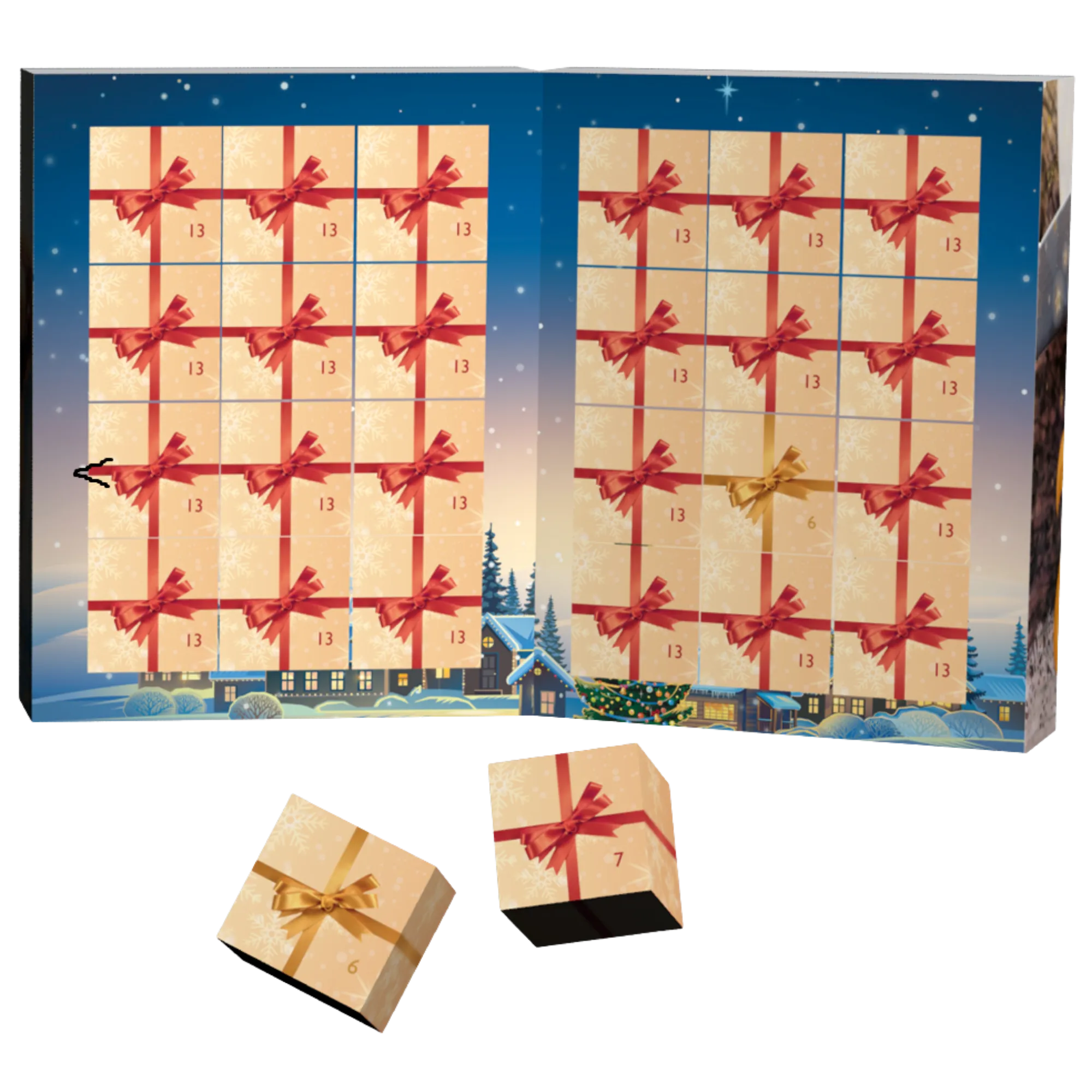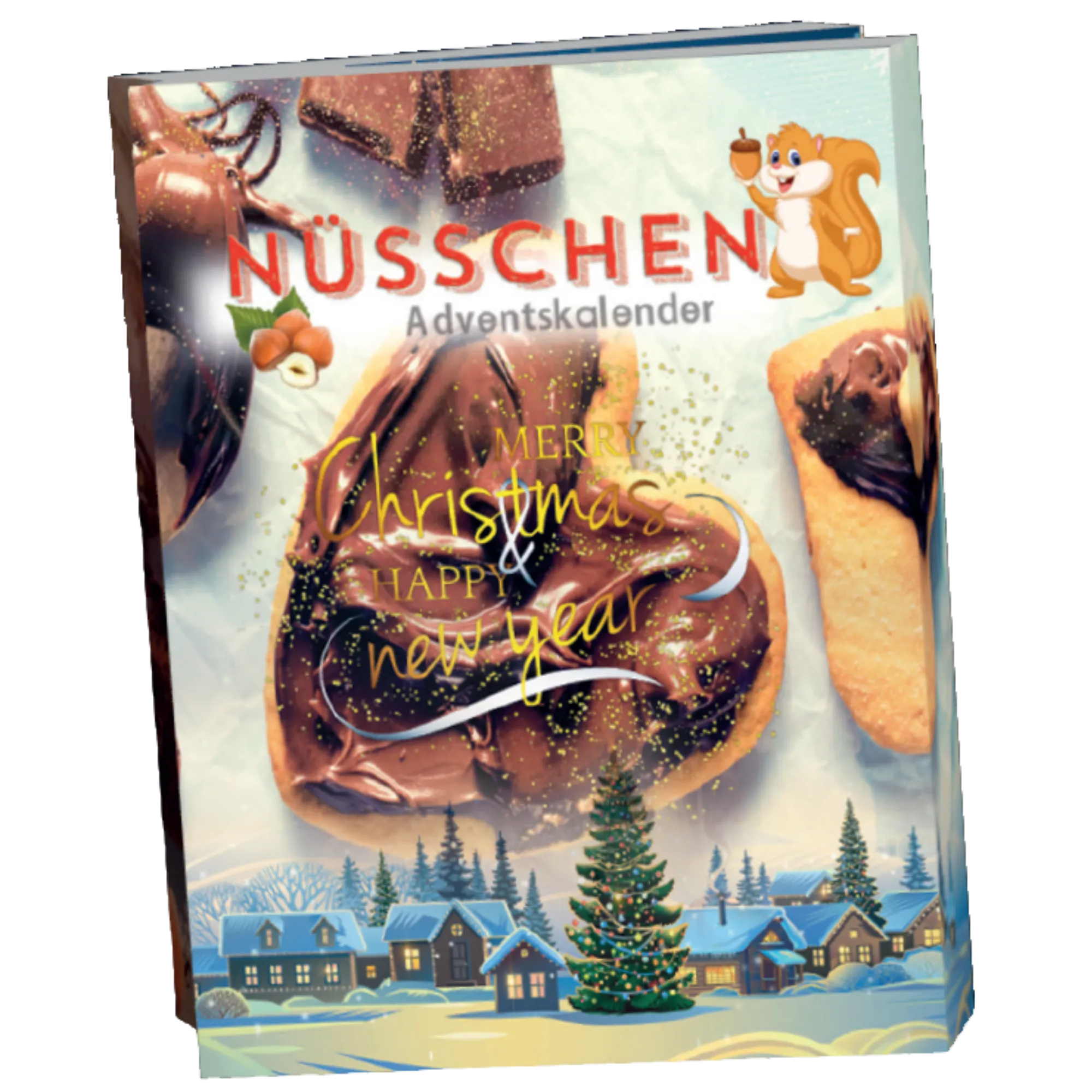 In diesem schönen Adventskalender in aufklappbarer Buchform verbergen sich 24 Würfel. Diese sind gefüllt mit allen Süßigkeiten, die man mit dem Begriff Nuss in Verbindung bringt: