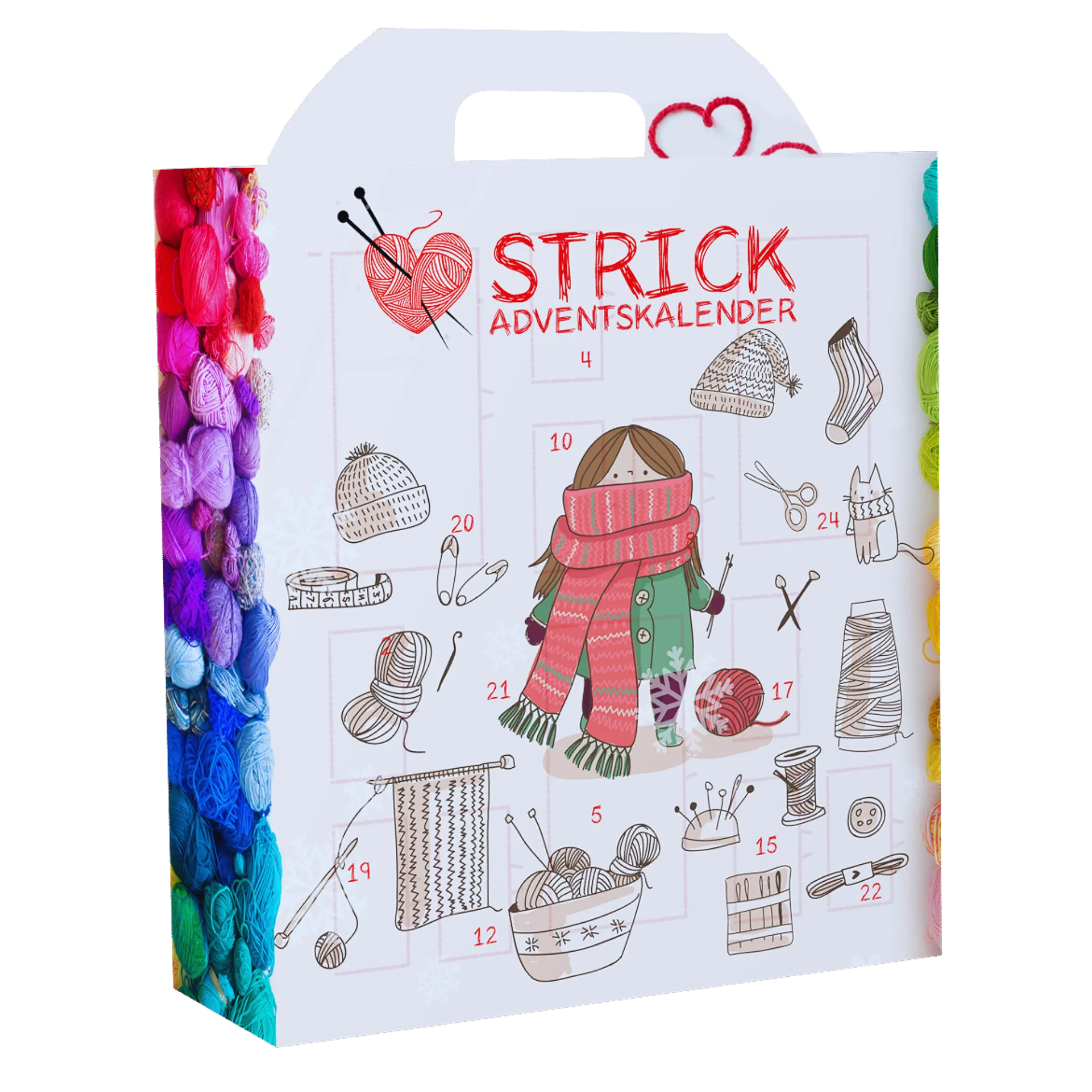 Dieser Strick-Adventskalender begeistert mit 24 Überraschungen, die das Herz jedes Strickliebhabers oder Strick-Neuanfänger höherschlagen lassen.